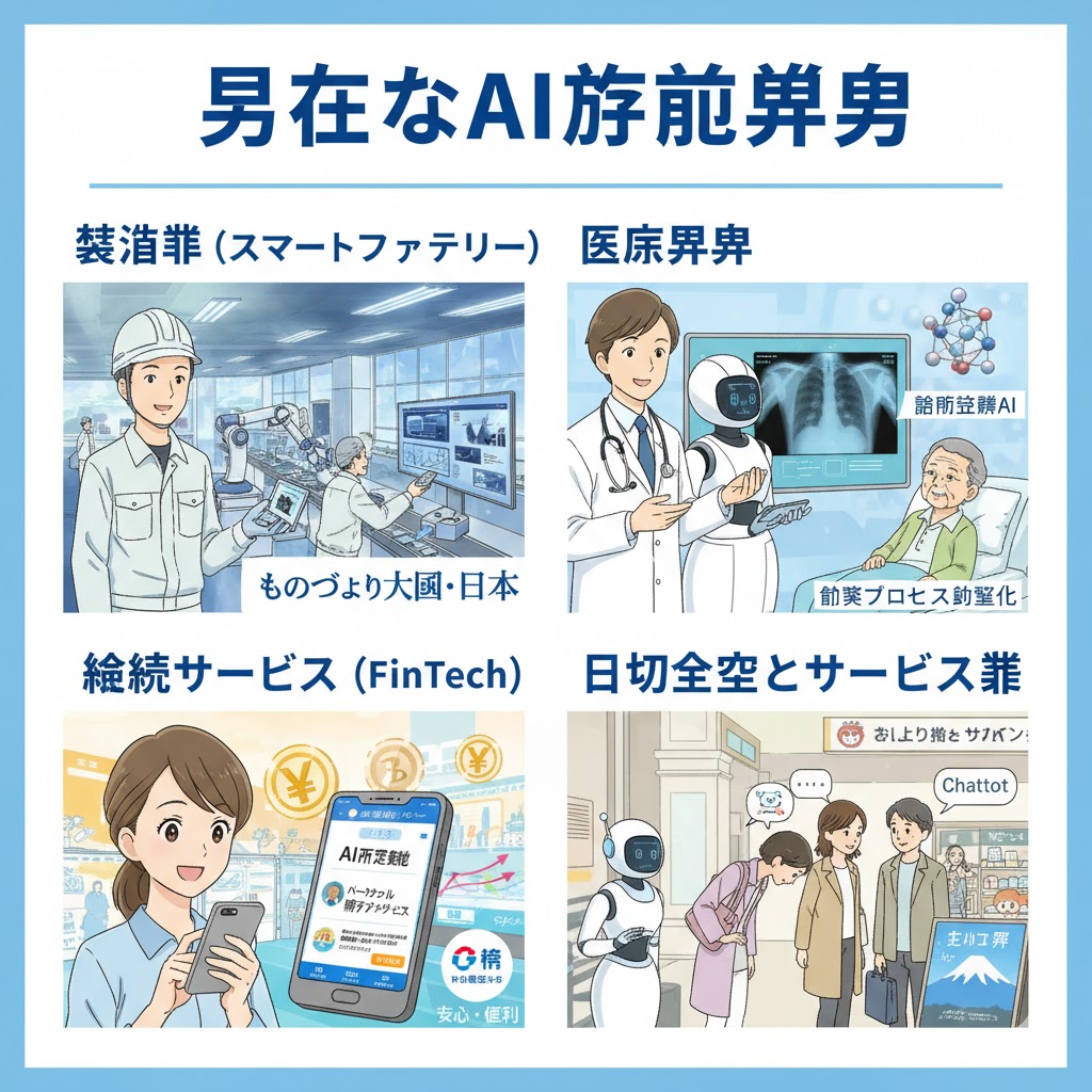 日本の製造業は品質管理と効率化に強みがあります。AIを活用することで、不良品検知、予知保全、生産ラインの最適化が可能になります。これは「ものづくり大国・日本」の競争力をさらに高める取り組みです。 - 医療分野